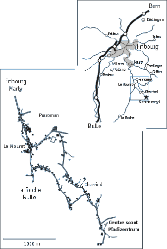 Mit dem Auto: Aus Freiburg kommend Richtung Bulle über La Roche: Marly, Le Mouret und Oberried (Les Peubliers)